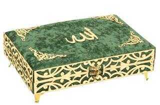 İkra Serisi Kadife Kaplamalı Ahşap Plaket Kut Çanta Boy Bilgisayar Hatlı Arapça Kadife Kuran-ı Kerim + Namaz Başörtüsü + Cam İnci Tesbih + Taşıma Çantası Hediye Seti Yeşil (90529)